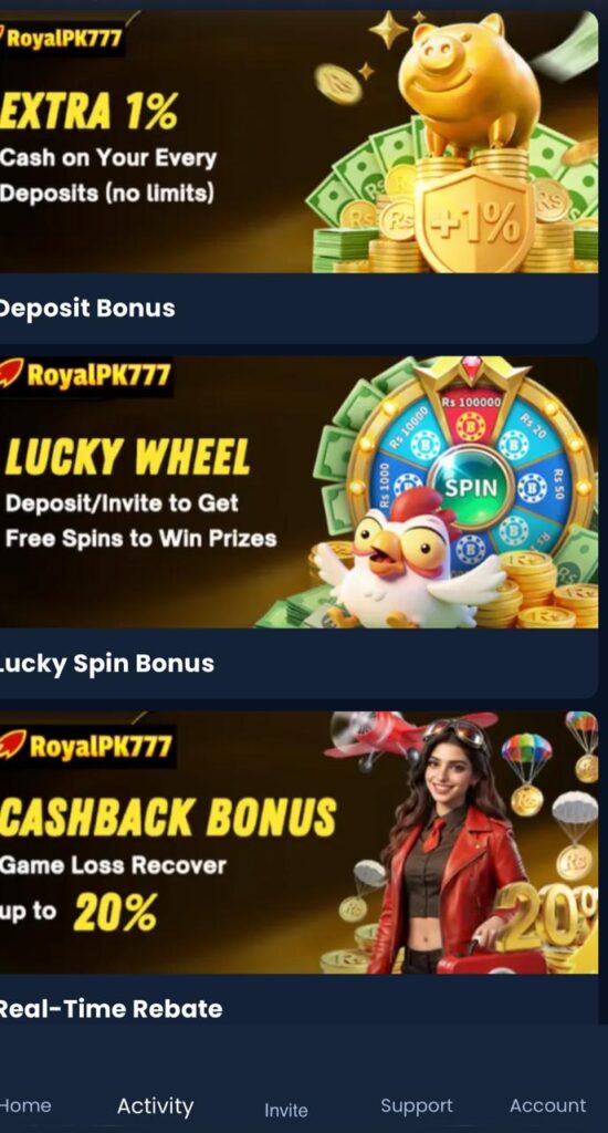 The app’s payment flexibility also plays a big part in its success. With support for EasyPaisa, JazzCash, and bank accounts, users can easily deposit or withdraw from anywhere in Pakistan. These familiar and trusted options make it convenient for everyone, whether they are students, workers, or professionals. The reliability of payments and fairness in rewards are the biggest reasons why players continue to recommend RoyalPk 777 to others.
